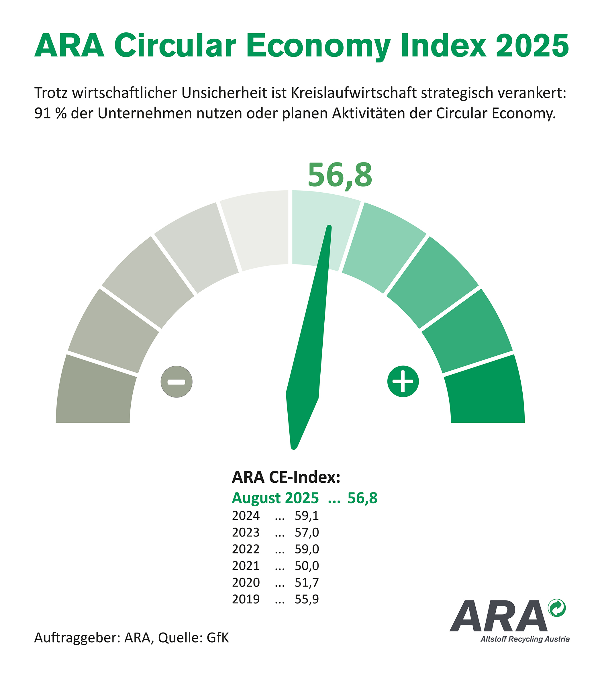 Kreislaufwirtschaft ist in österreichischen Unternehmen fest verankert – 91 % nutzen oder planen die Umsetzung von Circular Economy. Diesen neuen Höchstwert ergibt das diesjährige Circular Economy Barometer der Altstoff Recycling Austria AG (ARA) in Zusammenarbeit mit dem Marktforschungsinstitut NIQ/GfK. Trotz des Rekordniveaus ist die Investitionsbereitschaft der Unternehmen im Jahr 2025 rückläufig, vor allem bei kleinen Betrieben – ein Spiegel der allgemeinen Wirtschaftslage. Das zeigt sich auch an kritischen Punkten wie etwa der Rohstoffversorgung: 44 % der Unternehmen sind auf Importe aus dem Ausland angewiesen, mehr als die Hälfte wünschen sich Unabhängigkeit und eine Versorgung aus nationalen Quellen.